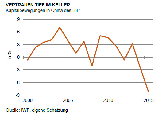 Leider gibt es in China keine offiziellen Statistiken zum Kapitalverkehr. Um trotzdem eine Vorstellung von der Entwicklung zu bekommen, habe ich sie aufgrund der Leistungsbilanz und der Währungsreserven geschätzt. Das Ergebnis finden Sie in der Grafik. Sie zeigt, wie sich der Kapitalverkehr in den letzten Jahren verändert hat. Lange Zeit war der Saldo positiv. Es strömte mehr Geld ins Land, als durch die Leistungsbilanz verdient wurde. Das war die Zeit des großen China-Booms. Das chinesische Modell schien zu funktionieren. Seit zwei Jahren ist der Lack ab. Investoren sind zunehmend skeptisch. Es fließt mehr Geld ab.