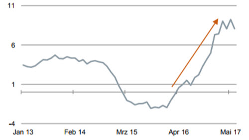 Was macht die Situation so gut? Das Wirtschaftswachstum ist so hoch wie zuletzt 2011. Der Internationale Währungsfonds hat seine Prognose noch einmal nach oben revidiert (auf 3,6 % in 2017 und 3,7 % in 2018). Das Wachstum ist breit basiert. Es gibt in der Welt nur sechs Staaten, die sich in einer Rezession befinden (unter anderem Venezuela). Die Emerging Markets erholen sich. Die Banken haben eine bessere Kapitalausstattung.
