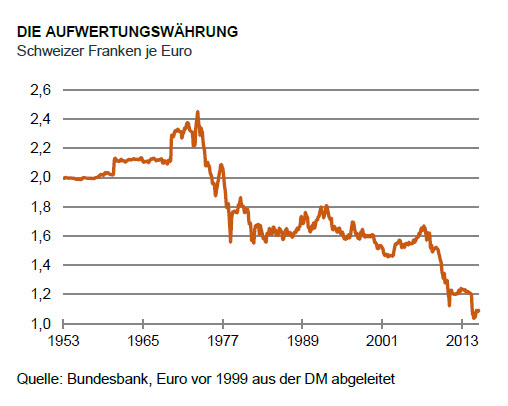 Zunächst zur Abwertung. Man darf hier nicht nur auf die aktuelle Entwicklung schauen. Man muss die Entwicklung vielmehr im längerfristigen Zusammenhang sehen. Da zeigt sich, dass der Franken überhaupt nicht schwach ist. Er hat sich in den letzten sechzig Jahren um über 50 % aufgewertet (siehe Grafik). Ich kenne keine große Währung, die in dieser Zeit so fest war. Einkaufen in Zürich oder der Urlaub in den Bergen ist nach wie vor extrem teuer. Der aktuelle Wechselkurs ist der Kaufkraftparität weit davongelaufen.