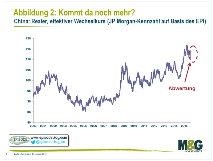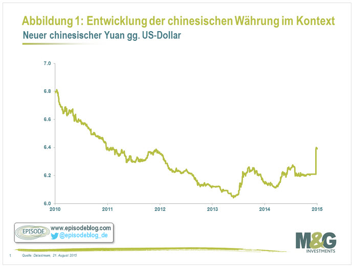 So auch aktuell in China. Der offensichtliche Auslöser der Kursverluste ist die jüngste Anpassung der Art und Weise, wie China seine Währung managt, was eine Abwertung des chinesischen Neuen Yuans gegenüber dem US-Dollar von etwa 3 Prozent zur Folge hatte (vergleiche Abbildung 1).