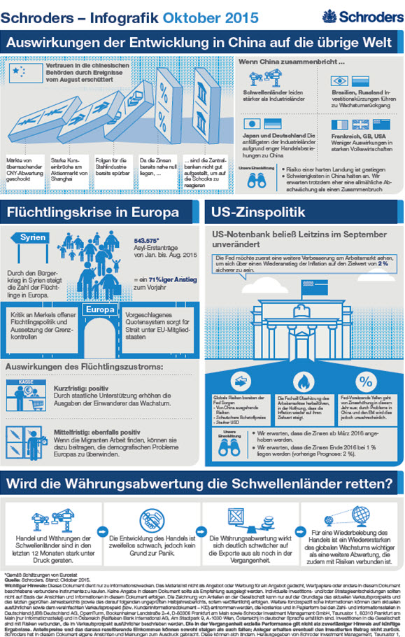 Im Oktober beleuchtet die Schroders-Infografik die Auswirkungen der Entwicklungen in China auf die Weltmärkte, die Flüchtlingskrise in Europa, die US-Zinspolitik sowie die Konsequenzen einer Währungsabwertung für die Schwellenländer.