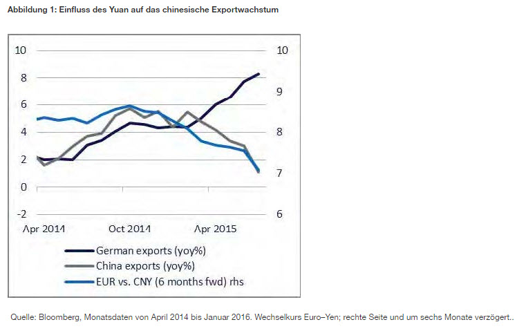chinesischen Kapitalflüssender chinesischen WährungRohstoffenSchwellenländernder US-WirtschaftDer Spielraum oder die Bereitschaft dafür ist unseres Erachtens jedoch kaum vorhanden. Durch eine Aufwertung des Yen oder des Euro würden diese Volkswirtschaften nach unserem Dafürhalten rasch an Schwung verlieren. Aus diesem Grund sind weder die japanische Notenbank noch die Europäische Zentralbank offenbar gewillt, eine deutliche Stärke ihrer Währungen zuzulassen.