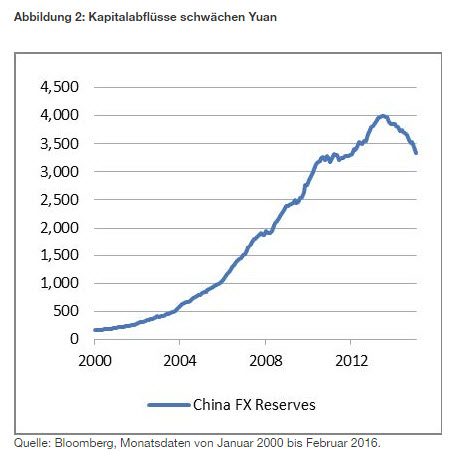 Da das Wachstum unter Druck geraten war, kam es in dem Versuch, gegenzusteuern, zu einer binnenwirt-schaftlichen Lockerung. Die geringeren Anlagechancen führten in Verbindung mit den niedrigen Zinsen zu Kapitalabflüssen (Abbildung 2). Diese wiederum setzten die Wechselkursanbindung des chinesischen Yuan unter Abwertungsdruck. Gleichzeitig exportierten sie den Druck auf die Preisniveaus in die Weltwirtschaft.