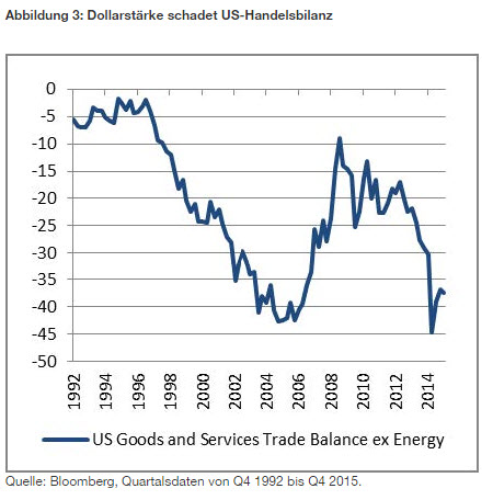 Der stärkere US-Dollar trug zu schwierigeren Bedingungen in den USA bei. Denn die Stärke des US-Dollar schwächte die Wettbewerbsfähigkeit der US-Wirtschaft. Außerdem belastete die vormals blühenden Sektoren Produktion und Industrie. Das ist eine Folge rückläufiger Nachfrage nach US-Exporten. Diese geht wiederum sowohl auf den gestiegenen Wechselkurs wie auch auf Zölle oder Einfuhrobergrenzen in den Schwellenländern zurück. Dadurch sank das US-Handelsdefizit ohne Energieprodukte wieder auf die Niveaus der 2000er Jahre – dem Höhepunkt der Handelsbeziehungen zwischen den USA und China.