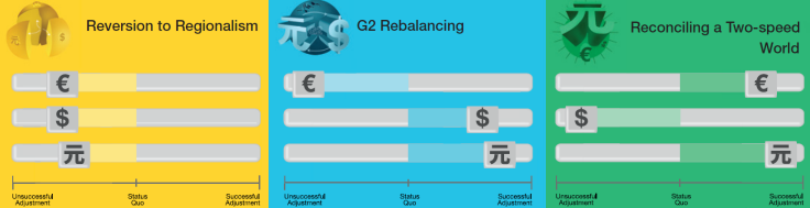 Ein anderes Szenario hält den langsamen Zerfall und Marginalisierung der Eurozone für denkbar. Die Staaten kehrten zu ihren nationalen Währungen zurück und es konstituierte sich ein neues Weltwährungssystem aus US-Dollar und Yuan („G2-Rebalancing“). Ein drittes Szenario rückt vor allem China in den Fokus: Es definiert den Yuan als Leitwährung, der Euro erholt sich und bleibt international die zweitwichtigste Währung („Two-speed World“). Der US-Dollar hingegen spielt dann keine Rolle mehr.