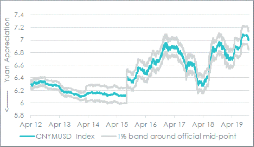 Da die Handelskonflikte im vergangenen Jahr Dreh- und Angelpunkt der Marktdynamik waren, überrascht es im Rückblick nicht, dass der Renminbi (CNY) um –2,75 Prozent an Wert verloren hat. Die Aussicht auf schwächere Wirtschaftsergebnisse, die auf Protektionismus im Handel und eine aufgeblähte Inlandsverschuldung zurückzuführen sind, führen uns zu der Annahme, dass dies im Ergebnis unumgänglich war. Es überrascht uns jedoch, dass die chinesischen Behörden die Währung so stark an Wert haben verlieren lassen. 2015 wurde China vom Markt für eine starke Währungsabwertung abgestraft. 2019 wurde eine allmähliche Abwertung allgemein besser akzeptiert.