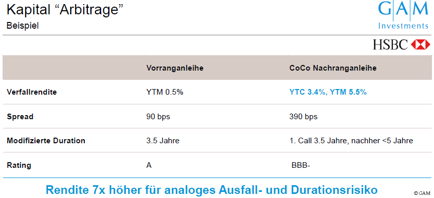 Überhaupt sei das Thema Risikomanagement immer präsent, sagt Gasser. Der Fonds, den er vorstellt, der GAM Star Credit Opportunities, investiert zu 80 Prozent in Nachranganleihen von Emittenten mit Investmentgrade. Vorteil: Bei solchen Papieren könne man die Kapital-Arbitrage sehr effizient ausspielen. Die Verfallrenditen betragen im Fonds durchschnittlich 4,2 Prozent. Zum Vergleich: Klassische fünfjährige Anleihen von Finanzinstituten bieten im Durchschnitt nur 0,4 Prozent an Rendite. Die Papiere im Fonds bieten also die zehnfache Rendite. Es ist eines der wirklich guten Argumente dafür, dass Nachranganleihen einen gebührenden Platz im Portfolio verdient haben.