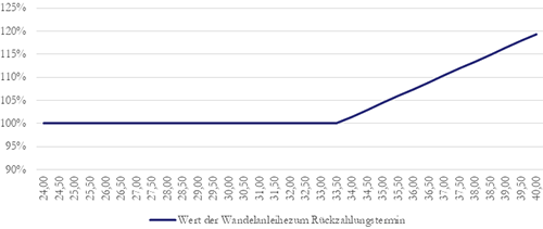 Gegenwärtig notiert die Aktie der Evonik bei knapp 29 Euro, noch im Januar stand sie zeitweise bei über 32,50 Euro. Am Ende der Laufzeit, dem 31.12.2018, wird die Wandelanleihe einen Wert von 100% im Falle von Kursen der Evonik Aktie unter dem Wandlungspreis (vermutlich rund 33,50 Euro) aufweisen und einen Wert von mehr als 100% im Falle von Kursen der Evonik Aktie über dem Wandlungspreis. Würde die Aktie beispielsweise im Bereich von rund 38 Euro handeln, so ergäbe sich ein theoretischer Wert von etwa 113% (siehe Graphik). Allerdings sollte der Investor noch einen kleinen Abschlag einkalkulieren, da die Wandelanleihe zunächst gewandelt und die Aktien erst in der Folge verkauft werden können. Da es viele Arbitrageinvestoren gibt, sollte dieser Abschlag allerdings nur geringfügig ausfallen. Investoren, die nicht die Möglichkeit haben, die Aktie vorab leer zu verkaufen, würden daher die Wandelanleihe sinnvollerweise erst kurz vor ihrem Ablauf veräußern.
