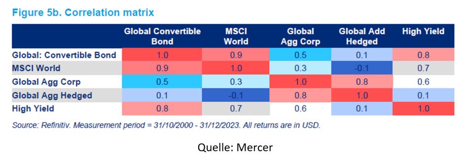 Ihre Stärken können Wandelanleihen auch in der Asset Allocation ausspielen: Ihre Allokation kann zur Reduzierung des Portfoliorisikos beitragen, ohne die Renditeerwartungen zu verändern, beziehungsweise die erwartete Rendite steigern, ohne das Risiko zu erhöhen. Dieser Effekt der Risikodiversifikation basiert vor allem auf der geringen Korrelation globaler Wandelanleihen mit globalen Staats- und Unternehmensanleihen. Auch die geringere Volatilität globaler Wandelanleihen im Vergleich zu Aktien kann das Portfoliorisiko reduzieren. Ebenso der geringere Drawdown, weil Wandelanleihen ein asymmetrisches Risiko-Ertrags-Profil haben.