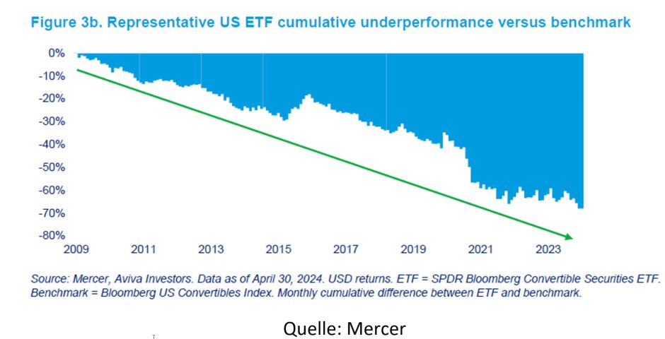 Bei Investments in Wandelanleihen sollten Anleger ETFs meiden, weil diese im Durchschnitt deutlich schlechter abschneiden als aktiv gemanagte Pendants. Wichtige Gründe sind, dass durch die häufige Anpassung der Indexzusammensetzungen hohe Transaktionskosten entstehen und aktive Manager Sondersituationen (Corporate Actions/Special Situations) besser nutzen können. Zudem ist die TER von ETFs mit durchschnittlich 0,4% bis 0,5% nicht viel tiefer als die von aktiv gemanagten Wandelanleihenfonds (etwa 0,7%).