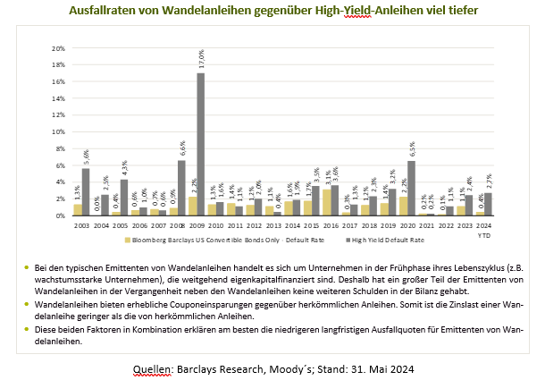 Auch die tiefe Ausfallrate von Wandelanleihen spricht für dieses Segment: Sie beträgt etwa ein Drittel der Ausfallrate von High-Yield-Unternehmensanleihen (Werte für Zeitraum 2003 bis 2024), obwohl das globale Wandelanleihenuniversum zu 21% aus High-Yield-Anleihen und nur zu 27% aus Investment-Grade-Anleihen besteht (für 52% gibt es kein Rating). Das hängt damit zusammen, dass typische Emittenten von Wandelanleihen Unternehmen sind, die sich in der frühen Wachstumsphase befinden und primär durch Aktienkapital finanziert sind. Deshalb hat die Mehrzahl der Wandelanleihen-Emittenten keine weiteren Schulden in der Bilanz. Weil Emittenten für Wandelanleihen tiefere Coupons als für herkömmliche Unternehmensanleihen zahlen müssen, ist auch die Zinslast wesentlich geringer.