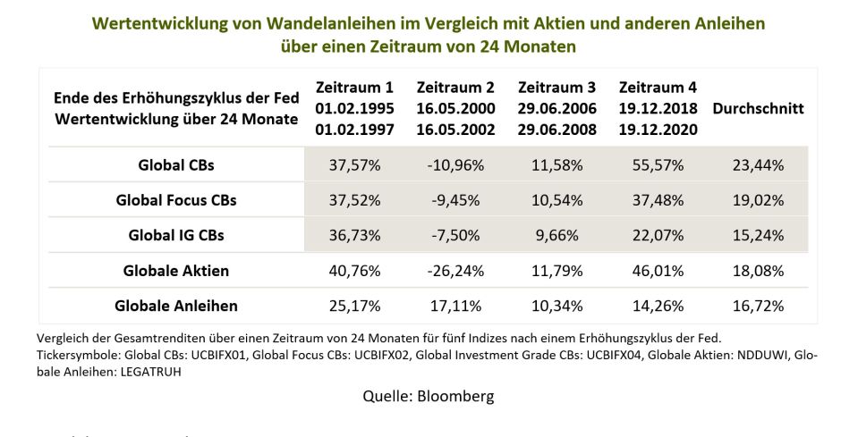 Ein wichtiger Treiber für die Wertentwicklung von Wandelanleihen ist das Ende des Zinserhöhungszyklus – sowohl der EZB als auch der Fed. Bereits in den ersten sechs Monaten nach Zinserhöhungszyklen (1995, 2000, 2006 und 2018/2019) erzielten Wandelanleihen nämlich eine Gesamtrendite, die zwischen derjenigen von Aktien und konventionellen Anleihen lag. Wenn man den Beobachtungszeitraum auf 24 Monate erweitert, sind die Ergebnisse – je nach Wandelanleihensegment – ähnlich gut beziehungsweise sogar deutlich besser.