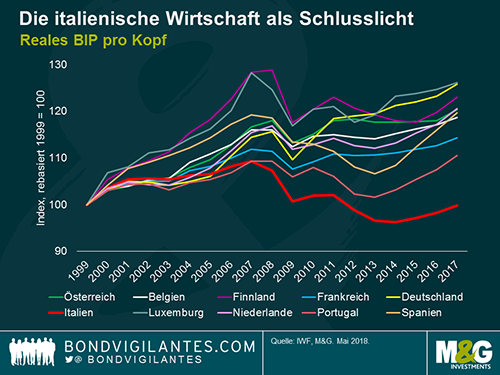 Eine anhaltende strukturelle Schwäche, Dysbalance und finanzielle Instabilität. Das sind einige Beispiele dafür, wie der Internationale Währungsfonds (IWF) im aktuellen Länderbericht die italienische Wirtschaft beschreibt. Fast zehn Jahre nach der großen Finanzkrise sind die wirtschaftlichen Perspektiven für Italien immer noch gedämpft, denn die Kosten lasten vor allem auf der jüngeren Bevölkerung und den Erwerbstätigen. Ohne eine amtierende Regierung werden die Perspektiven für die dringend notwendigen Reformen und Anpassungen durch die tief gespaltene Wählerschaft erschwert. Die real verfügbaren Pro-Kopf-Einkommen liegen unterhalb der Niveaus von vor dem Euro-Beitritt, gleichzeitig bauen Italiens Partner im Euroraum ihren Vorsprung mit Blick auf das Wachstum des BIP pro Kopf und der Einkommen in den kommenden zehn Jahren vermutlich noch weiter aus.