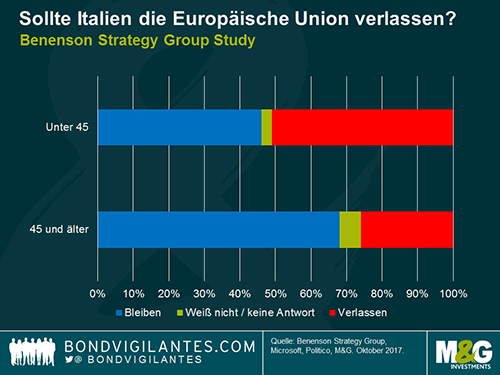 In Anbetracht des Politik- und Wirtschaftsumfelds überrascht es kaum, dass jüngste Umfrageergebnisse ergaben, dass, würde Italien ein Referendum zur EU-Mitgliedschaft durchführen, 51 Prozent der Wähler unter 45 für einen Austritt stimmen und 46 Prozent für den Verbleib wählen würden (Wähler im Alter von über 45 Jahren unterstützten einen Verbleib in der EU mit 68 Prozent gegenüber 26 Prozent). Jüngere italienische Wähler sind mit der EU nicht zufrieden und glauben, dass die wirtschaftliche Konvergenz der EU-Mitgliedstaaten zu Lasten Italiens ging. Da jedoch fast die Hälfte der italienischen Bevölkerung älter als 45 Jahre ist, sind sie gegenüber den jüngeren Wählern deutlich in der Mehrzahl, was nahelegt, dass die Wahrscheinlichkeit für das Auslösen eines Verfahrens nach Artikel 50 gering ist.