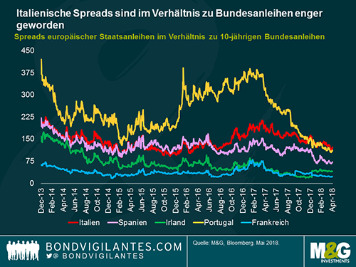 Für Anleiheninvestoren suggerieren der Mangel an Strukturreformen, hohe Schuldenquoten, das nur langsame Auslaufen der quantitativen Lockerungsprogramme und ein möglicher Regimewechsel bei der EZB (die ab November 2019 von einem neuen Präsidenten geführt werden wird), dass bei der Kreditvergabe an Italien mit längeren Laufzeiten Vorsicht geboten ist. Der Spread auf 10-jährige Papiere von 119 Basispunkten gegenüber Deutschland liegt unterhalb des Fünfjahresdurchschnitts von 159 Basispunkten, was nahelegt, dass die Herausforderungen, denen sich die italienische Wirtschaft gegenübersieht, teilweise nicht berücksichtigt werden. Darüber hinaus wurden die italienischen Renditen durch die quantitative Lockerung verzerrt, und es wird geschätzt, dass die EZB 28 Prozent der italienischen Staatsanleihen hält. Ihr gegenwärtig niedriger Spread im Vergleich zu Bundesanleihen ist auch symptomatisch für einen Markt, der angesichts niedriger Renditen an den „Kernmärkten“ für europäische Staatsanleihen auf der Suche nach Rendite ist. Auf relativer Basis sind die Spreads auf 10-jährige italienische Anleihen mit BBB-Rating höher als die der wichtigen WWU-Partner, und zwar einschließlich der Peripheriestaaten, die für die Schuldenkrise in der Eurozone verantwortlich waren.