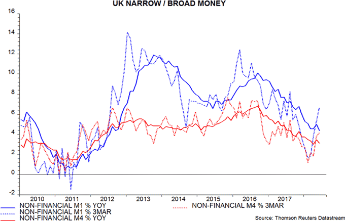 As usual, the focus here is on “non-financial” broad (M4) and narrow (M1) monetary aggregates, comprising money holdings of households and private non-financial businesses. The Bank of England’s M4ex measure additionally includes money held by non-bank financial corporations (excluding intermediaries) but such holdings are volatile and uninformative about future spending on goods and services*.