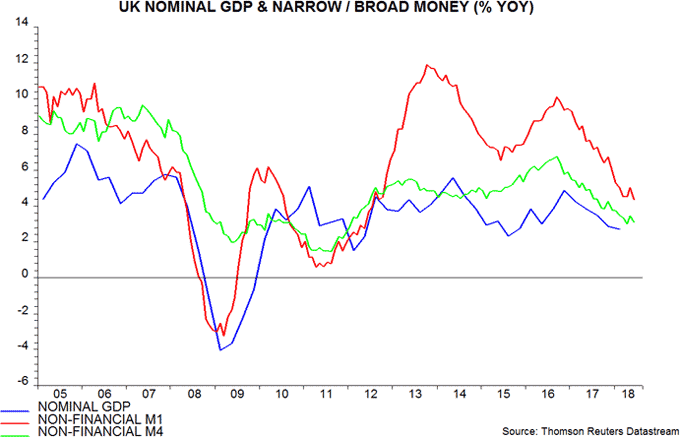 As the chart shows, the collapse in money growth since 2016 has been reflected in a significant slowdown in nominal GDP, annual expansion of which is currently estimated by the Office for National Statistics to have fallen to only 2.7% in the first quarter of 2018.