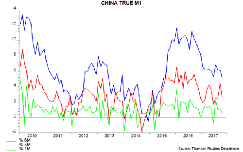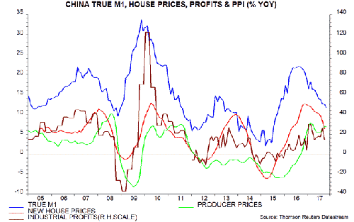 Annual growth of Chinese narrow money – as measured by the true M1 aggregate* calculated here – peaked at 22.1% in August 2016. In line with the normal historical pattern, the peak in narrow money growth was followed by peaks in annual house price inflation (November 2016), industrial profits growth (January / February 2017) and producer price inflation (February 2017) – see first chart.