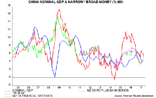 The issue for analysts is whether the money / credit slowdown signals a normalisation of economic growth and inflation after a period of buoyancy or rising risk of a “hard landing” scenario. Current narrow money trends still suggest the former.