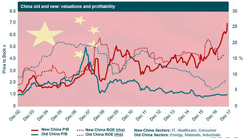 Investmentchancen sieht er dagegen in den überwiegend staatseigenen Fertigungs- und Industrieunternehmen, die mit "Old China" assoziiert werden (siehe Grafik). „Diese Aktien wurden in den vergangenen Jahren vernachlässigt, da sich die Anleger auf das Thema Konsum konzentriert haben. Allerdings sind Sektoren wie Energie und Industrie in letzter Zeit rentabler geworden – was sich jedoch nicht in ihren Bewertungen niedergeschlagen hat. Das führt zu einer interessanten Situation“, erläutert der Schwellenländerexperte.