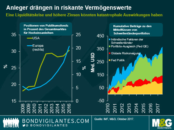 Die lockere Geldpolitik treibt Investoren in immer riskantere Anlagen. Notenbanken möchten so die Inflation anschieben, doch die Entwicklung könnte sich zu einem ernsthaften Risiko für das weltweite Finanzsystem auswachsen. Fonds sowohl in den USA als auch in Europa haben die Investitionen in den High-Yield-Markt auf der jeweils anderen Seite des Atlantiks stark ausgeweitet. Auch bei Schwellenländeranleihen spielt die Geldpolitik eine wichtige Rolle. Der IMF schätzt, dass seit 2010 rund 260 Milliarden US-Dollar allein aufgrund der Geldpolitik der Fed in die Schwellenländer geflossen sind.