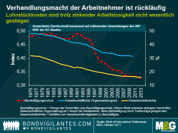 Arbeitnehmer haben immer weniger Einfluss auf ihre Löhne. Das zeigt sich an der nur moderaten Lohnentwicklung trotz niedriger Arbeitslosigkeit. Das Problem dabei: Das Lohnniveau ist ein wichtiger Inflationsfaktor, denn höhere Löhne verteuern die Produktion und treiben so die Preise. Erstmals haben deshalb Notenbanker wie Mario Draghi und Haruhiko Kuroda die Gewerkschaften aufgefordert, ihre Lohnforderungen zu erhöhen – Draghi mit dem Hinweis, Löhne seien „der wichtigste Inflationstreiber überhaupt“.Je mehr Nachdruck Arbeitnehmer ihren Lohnforderungen verleihen, desto wahrscheinlicher ist es, dass Arbeitgeber ihnen entsprechen. Doch die Durchsetzungskraft im Bereich der kleinen und mittleren Einkommen ist seit den frühen 90er Jahre gefallen. Gewerkschaftsdichte und gewerkschaftlicher Organisationsgrad haben abgenommen, der Kündigungsschutz wurde geschwächt. Arbeitnehmer finden sich heute in einer geschwächten Position wieder, wenn es um die Durchsetzung von Lohnforderungen geht. Wenn sie keine höheren Löhne durchsetzen können, dann werden sie voraussichtlich Realeinkommensverluste hinnehmen müssen. In Großbritannien ist das der Fall: Dort stiegen die Löhne seit 2008 um 16 Prozent, die Inflation im selben Zeitraum aber um ganze 25 Prozent.