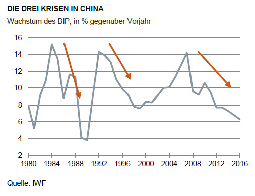 Schauen Sie sich die Grafik an. Sie zeigt die Entwicklung des BIP in China in den letzten 35 Jahren. Es sind klar drei Krisen zu erkennen.