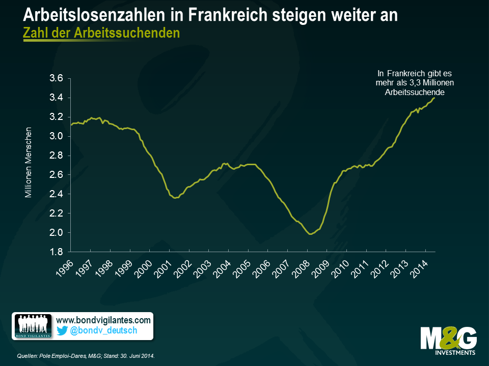 Seitdem hat es sich stets als schwierige Aufgabe erwiesen, in Frankreich Reformen umzusetzen. Nachdem in der vergangenen Woche aber vermeldet wurde, dass die Wirtschaft dieses Landes im nunmehr zweiten Quartal in Folge stagniert hat, scheint zumindest an einer „gewissen“ Veränderung nun offenbar kein Weg mehr vorbeizuführen. Im letzten Jahr hat Frankreich ein Wachstum von lediglich 0,1 Prozent vorgelegt. Darüber hinaus weist der Staatshaushalt trotz extrem niedriger Zinsen und einer Verschärfung der Fiskalpolitik immer noch ein strukturelles Defizit auf, während die Verschuldung im Vergleich zum BIP von vormals 77 Prozent zuletzt auf 93 Prozent angestiegen ist. Noch beunruhigender aber ist der Umstand, dass die Zahl der Arbeitssuchenden trotz des sehr lautstark geäußerten Versprechens des französischen Staatspräsidenten Hollande, „bei der Arbeitslosenquote eine Trendwende herbeizuführen“, momentan alarmierend rasant ansteigt. Dadurch werden sowohl das Verbrauchervertrauen als auch die Investitionsausgaben der Unternehmen belastet.