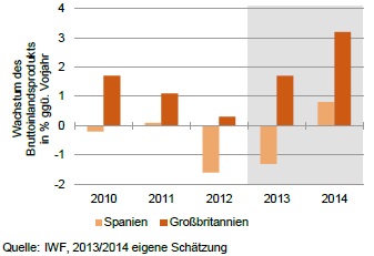 Das zweite ist Spanien, das eine lange Durststrecke hinter sich hat und 2014 erstmals eine Zunahme des realen Sozialprodukts erreichen wird. Das dritte ist Großbritannien, das in den letzten Monaten wie ein Phönix aus der Asche hervorkam. In zwei dieser Länder haben die Finanzmärkte mit Euphorie auf die Verbesserungen reagiert. Im dritten, nämlich Großbritannien, hat sich dagegen nichts gezeigt. Haben die Märkte hier etwas übersehen (und werden vielleicht noch reagieren), oder liegen hier unterschiedliche Verhältnisse vor?
