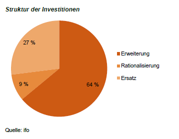Nur etwas weniger als zwei Drittel aller Investitionen (64 %) dienen der Erweiterung. Aber auch hier muss man unterscheiden. Nur bei einem geringen Teil wird einfach mehr produziert. In der Mehrzahl der Fälle handelt es sich um Maßnahmen zur Änderung und Ausweitung des Produktionsprogramms. Ein Automobilunternehmen baut ein neues Werk, um ein neues Modell auf den Markt zu bringen. In der Regel läuft dann früher oder später ein altes Modell aus. Das heißt, an anderer Stelle werden Kapazitäten abgebaut.