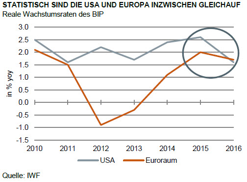 Die Europäer spielen in dieser Weltsicht nur eine Nebenrolle. Sie haben hohe Arbeitslosigkeit und langsames Wachstum (obwohl die Zunahme des realen BIPs statistisch gesehen im Euroraum nicht geringer ist – siehe Grafik). Sie haben den Brexit. Sie sind politisch zerstritten. Sie haben eine Währung, von der viele immer noch annehmen, dass sie bald zusammenbrechen werde. Früher war Deutschland immer noch ein Leuchtturm. Inzwischen ist aber auch das vorbei. Das Land scheint von der Bildfläche verschwunden. Die deutschen Banken werden in einem Atemzug mit den italienischen genannt. So viel Kritik an Deutschland habe ich schon lange nicht mehr gehört.