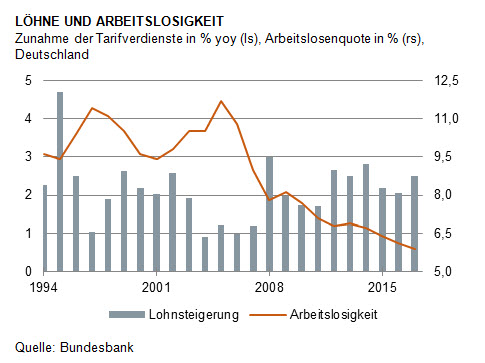 Das bedeutet: Die Finanzkrise hat nicht nur die Finanzmärkte in Unordnung gebracht. Sie hatte auch nachhaltigen Einfluss auf den Arbeitsmarkt. Die üblichen Marktkräfte wirken nicht mehr. Die Löhne haben sich von der Beschäftigung emanzipiert. Das ist nicht nur ein deutsches Phänomen. Auch in anderen Ländern ist es zu beobachten. In den USA beispielsweise steigen die Löhne und Gehälter trotz Vollbeschäftigung und niedriger Arbeitslosigkeit derzeit nur um 2,5 %.