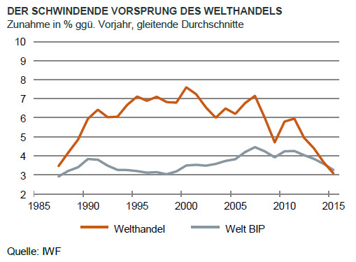 Damit scheint es inzwischen jedoch vorbei zu sein. Die Grafik zeigt, wie sich die Dynamik des Welthandels schon in den letzten Jahren verlangsamt hat. In den 90er Jahren wuchsen die realen Ex- und Importe noch zeitweise mehr als doppelt so schnell wie das Weltsozialprodukt. In den letzten fünf Jahren laufen die Raten jedoch zusammen. Seit 2012 wächst der Welthandel überhaupt nicht mehr schneller.