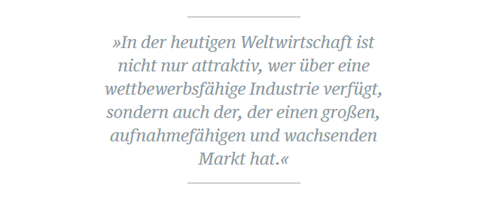 In der heutigen Weltwirtschaft ist nicht nur attraktiv, wer über eine wettbewerbsfähige Industrie verfügt, sondern auch der, der einen großen, aufnahmefähigen und wachsenden Markt hat. Das ist in Großbritannien der Fall. Es macht das Land weniger verletzlich gegenüber protektionistischen Tendenzen.