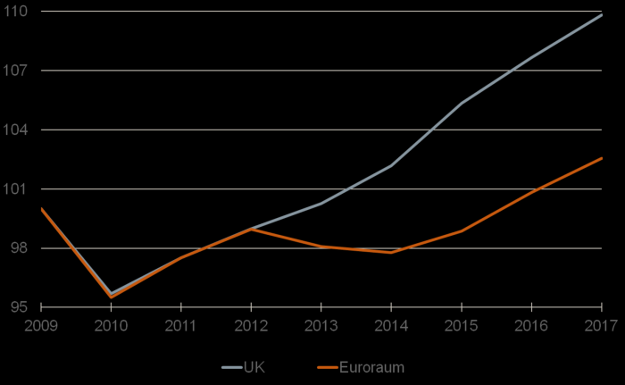 Natürlich neigen Londoner Banker gegenüber Deutschen dazu, ihr Licht noch etwas heller leuchten zu lassen. Wenn man sich jedoch die ökonomischen Fakten anschaut, dann sieht die Lage in Großbritannien in der Tat besser aus als viele denken. Die Konjunktur hat nach der Brexit-Entscheidung zwar ein paar Tage gelitten. Dann hat sie sich jedoch kräftig erholt. Im Gesamtjahr 2016 ist das reale BIP in Großbritannien mit 1,8 % noch etwas stärker gestiegen als im Euroraum (1,6 %). In diesem Jahr könnte es noch mehr zunehmen.