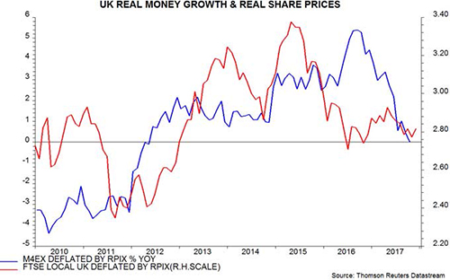The rule suggested that 2017 would be an average year: real M4ex growth rose from 2.5% to 4.5% between December 2015 and December 2016 but real share prices fell by 10.4% – the FTSE local UK index, unlike the FTSE 100 and all-share indices, did not enjoy a currency-driven “Brexit bounce”**. The average GDP growth outcome historically for this combination was 1.9%. The current consensus estimate of 2017 GDP growth is 1.6% – below the average but above a consensus forecast of 1.2% in December 2016***.
