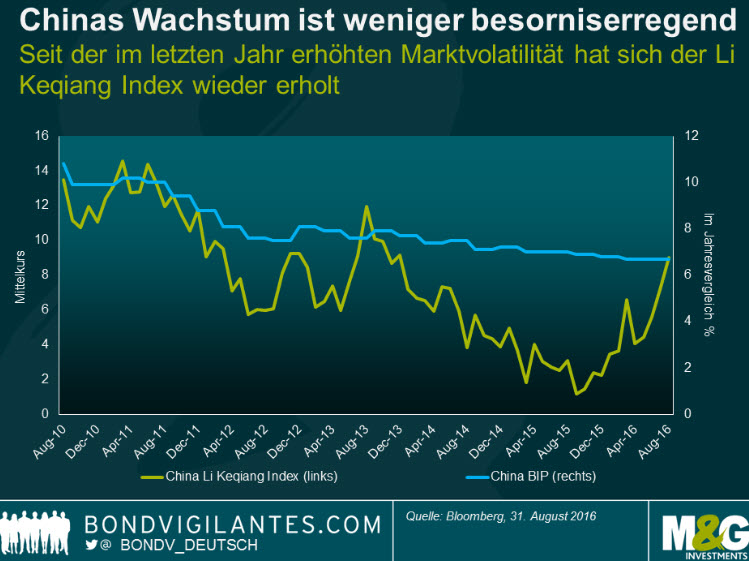 Im Gegensatz zum letzten Jahr haben die Diskussionen um China überraschend wenig Staub aufgewirbelt. Nach den großen Marktbewegungen und den Volatilitätsphasen im August 2015 und im Frühjahr dieses Jahres – ausgelöst durch Chinas FX-Adjustierung, steigende Ausfallquoten bei Unternehmensanleihen und beschleunigte Kapitalabflüsse – scheinen die Sorgen um eine „harte Landung“ nachgelassen zu haben. Stattdessen verlagerte sich der Fokus auf die verbesserte Zentralbankkommunikation und die in diesem Jahr relativ stabile Wirtschaft. Die Stimmung war auch in Hinsicht auf Chinas Umstellung auf eine Dienstleistungsgesellschaft positiv. Sie hat an Fahrt zugelegt, da die Kreditexpansion und der wachsende Konsumanteil am BIP eine gute Basis für Wachstum bietet und eine mögliche Abkühlung bei den Investitionen ausgleichen kann. Diese Stimmungslage fällt mit dem Aufwärtstrend des Li Keqiang Index (oft ein „besserer“ Maßstab für das chinesische Wirtschaftswachstum) in diesem Jahr zusammen.