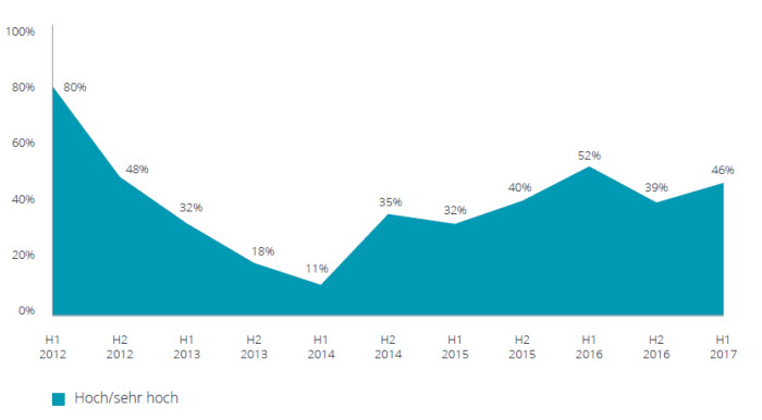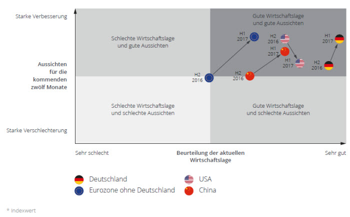 Die große Mehrheit der Befragten CFOs (96%) bewertet die wirtschaftliche Situation Deutschlands mit gut oder sehr gut. Immerhin drei Viertel der CFOs bewertet auch die Lage in den USA positiv. In Bezug auf den chinesischen Markt sowie die Eurozone verbessern sich die Einschätzungen ebenfalls.Die Erwartungen für die wirtschaftliche Entwicklung 2017 verlaufen in den meisten Fällen parallel zu dieser Bewertung. Sowohl für den deutschen als auch für den US-amerikanischen Markt gehen etwa ein Drittel der Befragten von einer weiteren Verbesserung aus. Im chinesischen Markt erwarten gut 25% eine bessere Entwicklung als in der Vergangenheit. Für die Eurozone liegt dieser Wert gar bei 40%. Allein für die USA sinkt der Anteil der Optimisten deutlich.