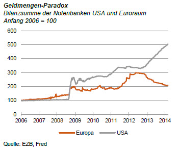 Im Augenblick denkt die EZB darüber nach, ob sie nicht ein Q/E-Programm amerikanischer Machart auflegen sollte. Sie hofft damit, die Deflation wirkungsvoller bekämpfen zu können. Ich zweifle, dass das sinnvoll ist. Es würde zwar mehr Power bringen. Die Bilanzsumme der EZB würde steigen. Ob es aber auch zu viel höheren Preissteigerungen führt, ist selbst nach den Berechnungen der EZB fraglich. Zudem würde es schwerer, den Ausstieg zu realisieren, wenn sich die Situation normalisiert. Auch daran muss man ja denken (zumal es vielleicht doch nicht mehr so weit entfernt ist).