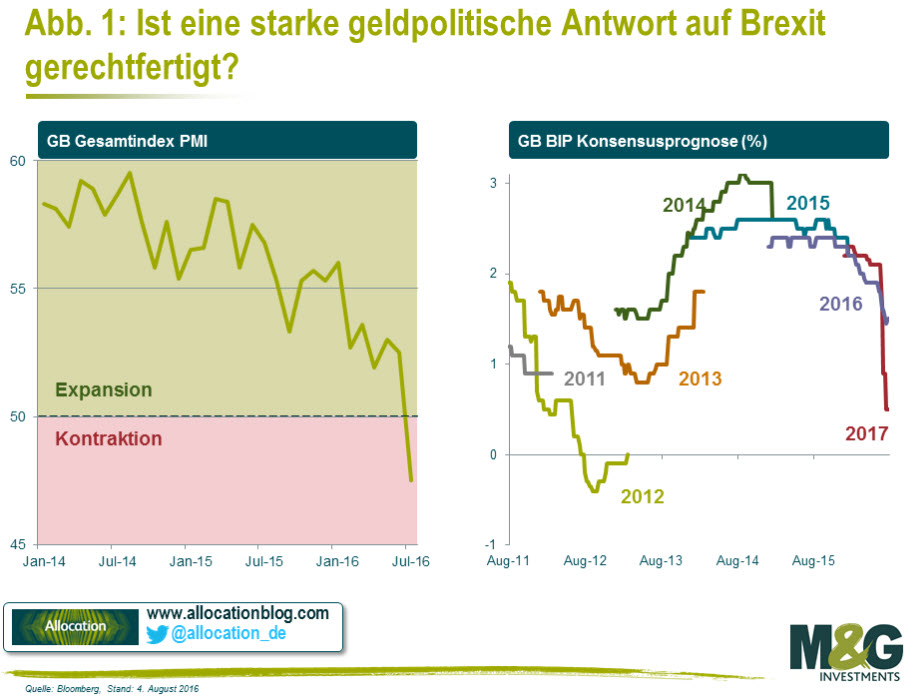 Die kürzlich bekannt gegebenen Maßnahmen könnten als eine notwendige Antwort auf eine erhebliche Bedrohung für das britische Wirtschaftswachstum gesehen werden. Die jüngste Verschlechterung in den Einkaufsmanagerindex-Umfragen ließ Bloomberg TV kommentieren, dass „wir in ernsten Schwierigkeiten“ seien und eine Gruppe britischer Experten forderte einen „Vorschlaghammer“, um die Wirtschaftsschwäche zu bekämpfen. Die Wachstumserwartungen sind zusammengebrochen.