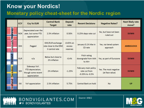 „Auch für die Zukunft ist davon auszugehen, dass diese Länder ihre Politik individuell gestalten werden“, sagt Rusius. So hält sie etwa in Norwegen, Finnland und Schweden weitere Absenkungen des Zinsniveaus für wahrscheinlich, während Island ihrer Meinung nach den Zinssatz eher weiter erhöhen dürfte – wie der „Spickzettel skandinavische Geldpolitik“ der M&G Bond Vigilantes zeigt:
