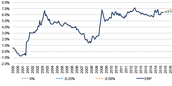 Perhaps the most direct way to examine the impact of negative rates on equities is through the discounted cashflow model (DCF). This allows us to estimate the intrinsic value of a stock by summing up the present value of all expected cashflows over the life of the security, discounted by the appropriate interest rate. Ceterus paribus, a lower risk-free rate should boost the present value of equities via a mechanical adjustment of valuations upwards. We believe that this phenomenon will be seen most clearly in Europe, where negative interest rates are creeping across sovereign bonds of all shapes and sizes in the region; the chart below illustrates the impact of negative interest rates on our measure of the equity risk premium for Europe.