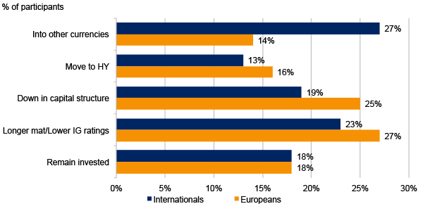 Whilst it’s hard to make explicit forecasts about the magnitude of potential flows, a recent macro survey showed that a large portion of existing owners of European investment grade credit were already considering a combination of overseas rotation and shift to lower-rated assets.