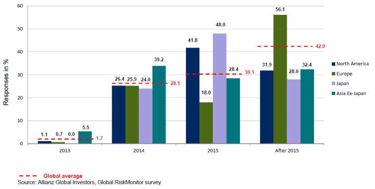 AllianzGI-Umfrage: Institutionelle Investoren aus den USA erwarten 2015 höhere Zinsen. Europäer nicht vor 2016.