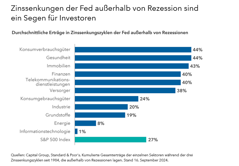 Drei der sieben Zinssenkungszyklen seit 1984 fanden außerhalb von Rezessionen statt. In diesen drei Zyklen ist der S&P 500 Index zwischen der ersten und der letzten Senkung um durchschnittlich 27% gestiegen. Fast jeder Sektor hat in diesem Zeitraum zweistellige Anstieg verzeichnet.