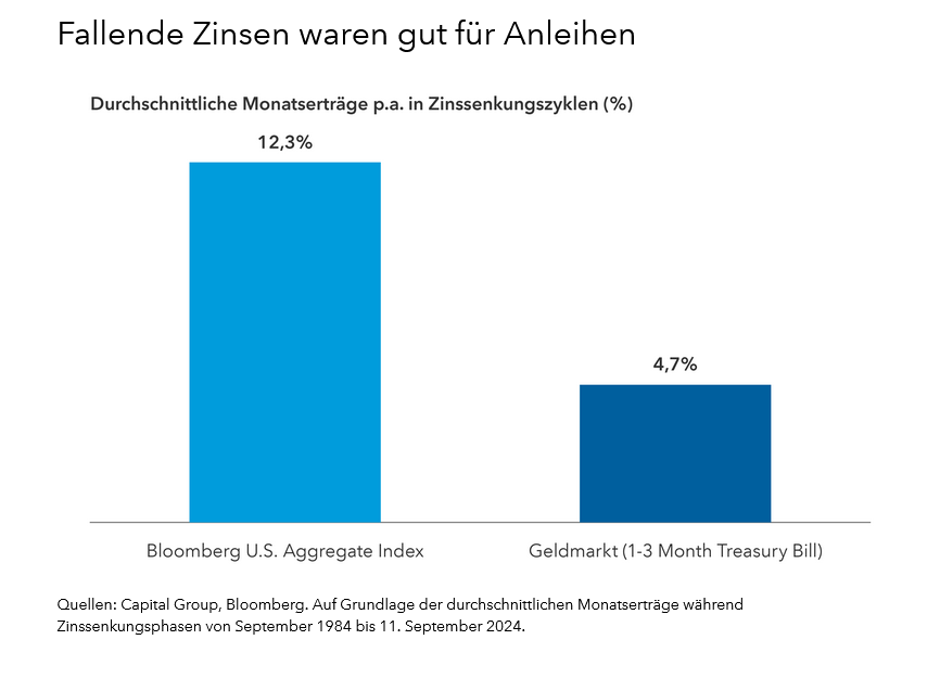 Bei einer Inflation von nur noch gut 2% hat die Fed viel Spielraum und kann im Falle eines Wachstumsschocks oder eines steigenden Rezessionsrisikos die Zinsen sogar noch schneller senken als die Marktteilnehmer zurzeit erwarten. Bislang waren Anleihen in Zinssenkungszyklen besonders erfolgreich, weil die Anleihenkurse steigen, wenn die Renditen fallen. Von September 1984 bis September 2024 waren die durchschnittlichen Erträge des Bloomberg US Aggregate Index im Durchschnitt erheblich höher als die Geldmarkterträge.