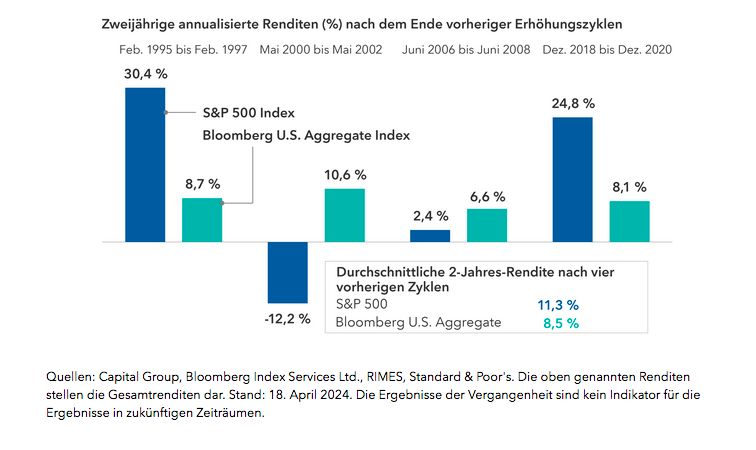 Im Laufe der Zeit neigen die Märkte dazu, sich an das vorherrschende Zinsumfeld anzupassen. Die Märkte können zu Beginn einer Zinserhöhungskampagne heftig reagieren, wie es 2022 der Fall war, als sowohl Aktien als auch Anleihen einbrachen. Sobald wir jedoch ein neues Maß an Stabilität erreicht haben, konnten die Märkte ihren langfristigen Wachstumskurs oft wieder aufnehmen, der mehr von den Unternehmensgewinnen und dem Wirtschaftswachstum beeinflusst wird als von der Geldpolitik, solange sich dieses Maß in einem angemessenen Bereich befindet.