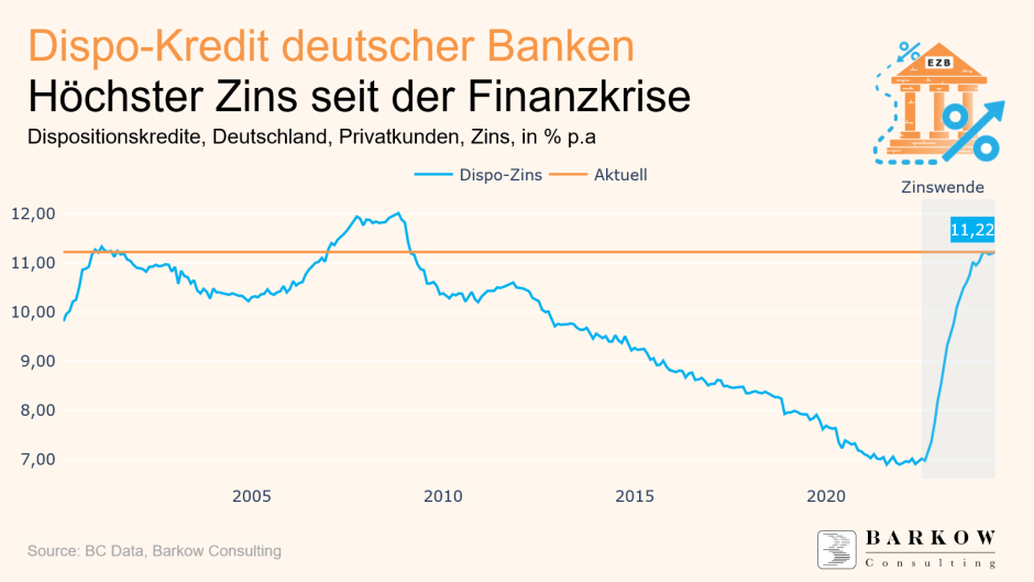 Der Dispozins für Privatkunden hat erneut zugelegt, meldet die Unternehmensberatung Barkow Consulting.