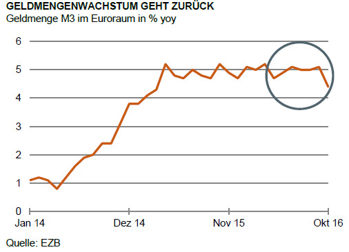 Die Geldmengenzahlen, die die Europäische Zentralbank jeden Monat bekannt gibt, sind an den Märkten nicht gerade der große Aufreger. Niemand versteht sie so richtig. Viele haben den Eindruck, dass sie nichts versäumen, wenn sie sich die Daten nicht näher anschauen. In der letzten Woche wurde jedoch etwas veröffentlicht, was es in sich hatte. Die Wachstumsrate der Geldmenge M3 hat sich innerhalb eines Monats von 5,1 % auf 4,4 % verlangsamt. So ein großer Rückgang ist ungewöhnlich. Dies umso mehr als sich bei der Politik der EZB in dieser Zeit nichts verändert hat. Deutet sich hier Ungemach an?