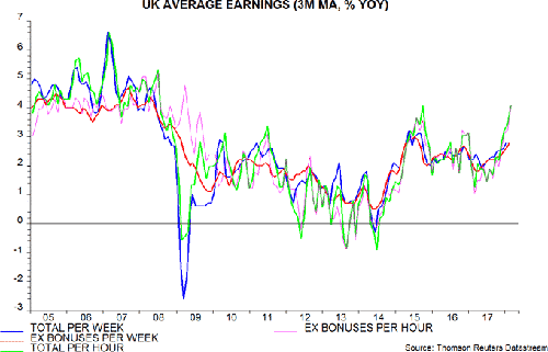 Hourly pay, moreover, is rising considerably faster because of a fall in average weekly hours worked over the last year. Hourly earnings growth, including or excluding bonuses, is estimated to have increased further to 4.0% in February, with the ex. bonuses measure the highest since 2009 – see first chart.